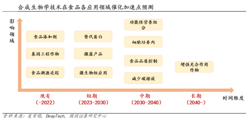 4)食品原料方面,生物制造创造新的食品原料可颠覆传统的食品供给格局,BCG预测2026年合成生物技术影响食品饮料的行业规模将达57亿美元,2021-2026年复合增长率超过50%。麦肯锡预计2023-2030年之间替代蛋白领域将迎来爆发,为值得关注的细分赛道。