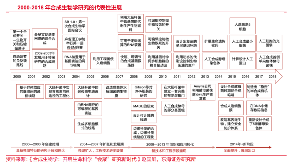 第一阶段:创建时期(2000-2003年):产生了具备领域特征的研究手段和理论,特别是基因线路工程的监理及其在代谢工程中的应用。
