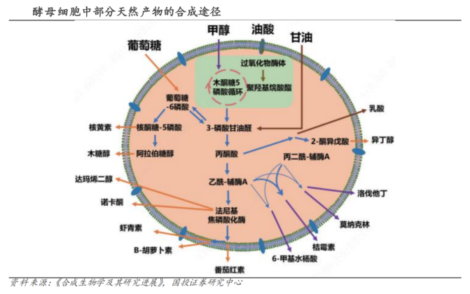 底盘细胞是合成生物学生产的基础。目前底盘细胞主要包括三个体系:真核细胞、原核细胞和通用植物底盘细胞,研究人员根据具体的研究和应用选择不同的生产体系。合成生物法将是替代传统提取法及化学法的理想技术路径。在底盘细胞被高度驯化后,天然产物大都可以实现异源合成,从而替代传统植物提取法和化工路线。