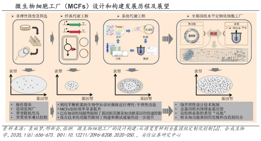 合成生物学:引领第三次生物技术革命,相比化学合成及传统发酵优势明显。合成生物学侧重创造自然界中尚不存在的人工生命系统,广义上可分为“基于细胞的合成生物学”和“无细胞合成生物学”,前者的核心在于微生物细胞工厂(MCFs)的构建,后者跳脱细胞膜限制,使得系统设计自由度显著提升。合成生物学相比传统化学合成、生物发酵具备明显优势,相对传统化学合成的优势主要表现为产品成本低、反应条件温和、对环境污染较小等;与传统发酵技术相比,基于MCFs理性设计策略的合成生物学技术效率显然更高。以青蒿素生产为例,根据国家发改委数据,使用可控的100立方米工业发酵罐,可以替代5万亩的传统农业种植生产青蒿素,显著降低生产成本。