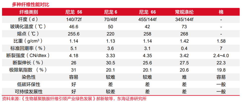 生物基PA56是一种新型生物基聚酰胺,其单体生物基1,5-戊二胺来源于葡萄糖。生物基PA56的热性能、力学性能及加工性能与PA66相当,可以和PA66一样通过注塑、吹塑、熔融纺丝等方式加工成形,另外,生物基PA56较PA66有更加优异的吸湿、染色及熔融流动性能,在工程塑料、薄膜及纤维领域有望大规模应用。