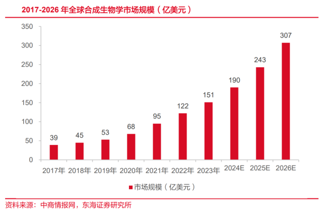 在政策支持和技术进步的推动下,合成生物学市场规模有望快速提升。根据中商产业研究院数据,2023年全球市场规模约为151亿美元,预计到2026年,市场规模有望达到307亿美元。