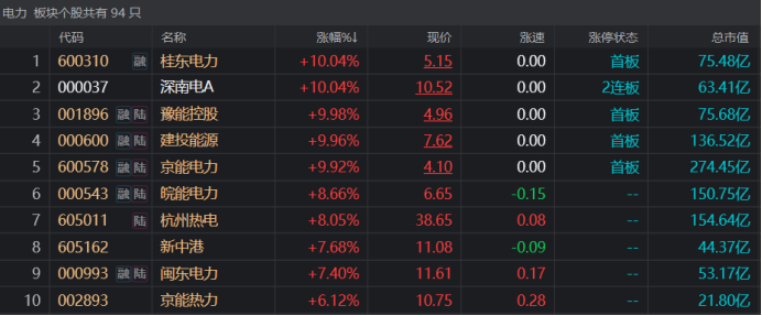 今日(6月26日),电力板块逆市走高,个股普遍拉升。截至午间收盘,桂东电力、深南电A、豫能控股、建投能源、京能电力封板涨停,其中,深南电A晋级2连板。此外,皖能电力、杭州热电、新中港、闽东电力等多也涨幅居前。