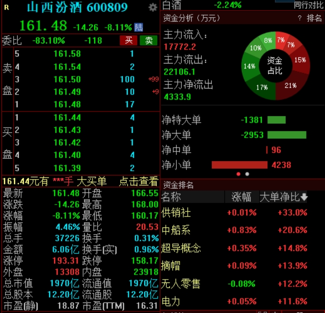 白酒股下挫!山西汾酒创2020年11月以来新低