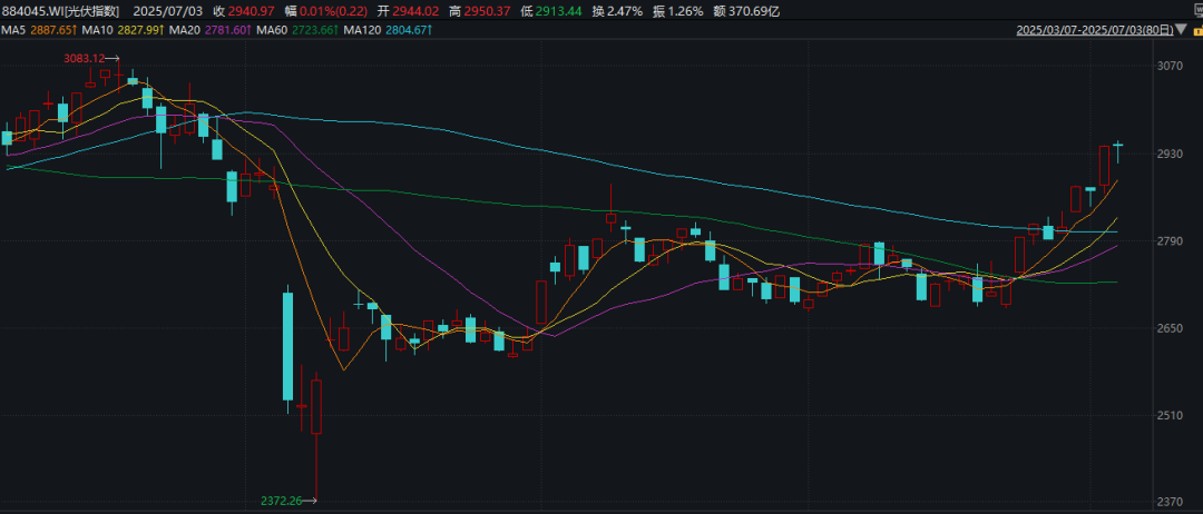 近日,A股光伏板块个股表现强势,自6月20日以来,Wind光伏指数累计上涨近10%。7月2日,Wind光伏指数大涨2.53%,板块内多只个股涨停;7月3日,Wind光伏指数继续小幅上行,亿晶光电、亚玛顿连续两日涨停。