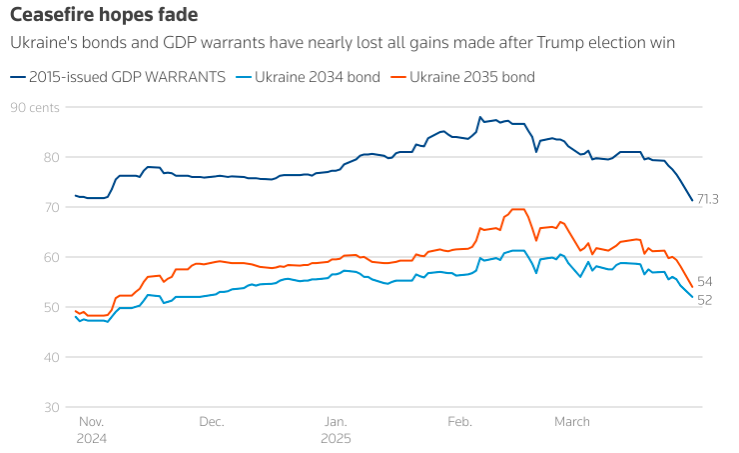 去年,乌克兰债券回报率曾超过60%,但随着特朗普上台后结束乌克兰冲突的提议近来接连遭遇挫折,其价格已再度大幅下跌,目前较2月份创下的历史高点已普遍下跌了约14-16美分。