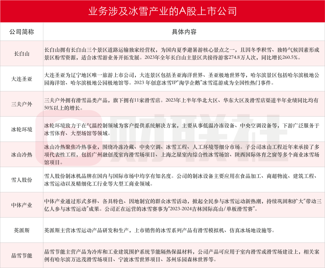 据财联社不完全整理和统计,包括长白山、大连圣亚、三夫户外、冰轮环境、冰山冷热、雪人股份、中体产业、英派斯、晶雪节能等在内的9家上市公司业务涉及冰雪产业,具体如下图: