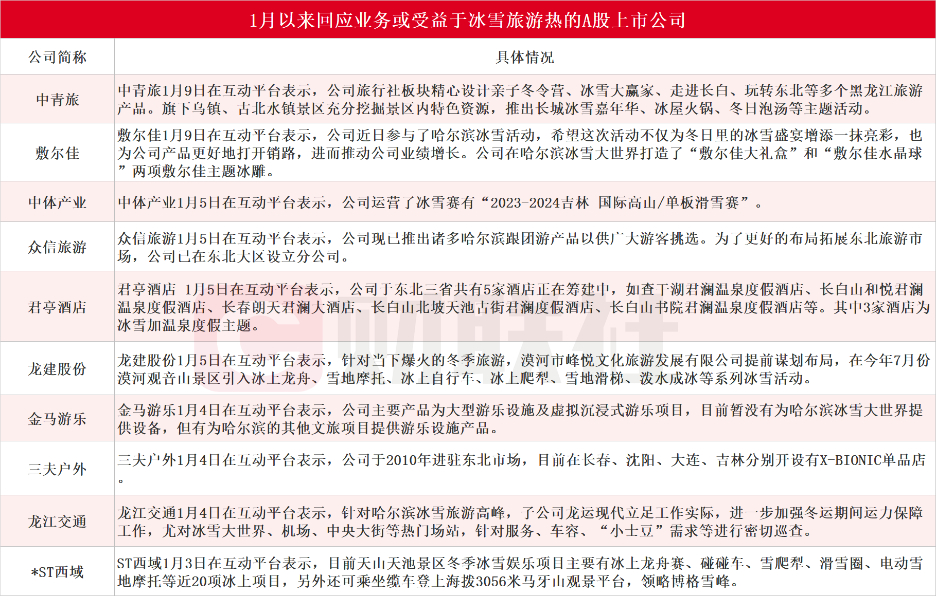此外,据财联社不完全梳理,中青旅、敷尔佳、中体产业、众信旅游、君亭酒店、龙建股份、金马游乐、三夫户外、龙江交通和*ST西域等上市公司1月以来回应业务或受益于冰雪旅游热,具体如下图: