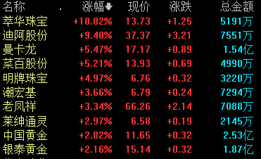 9月15日 ,黄金概念股表现活跃,截至发稿,萃华珠宝涨停,菜百股份、老凤祥、潮宏基、中国黄金等跟涨。