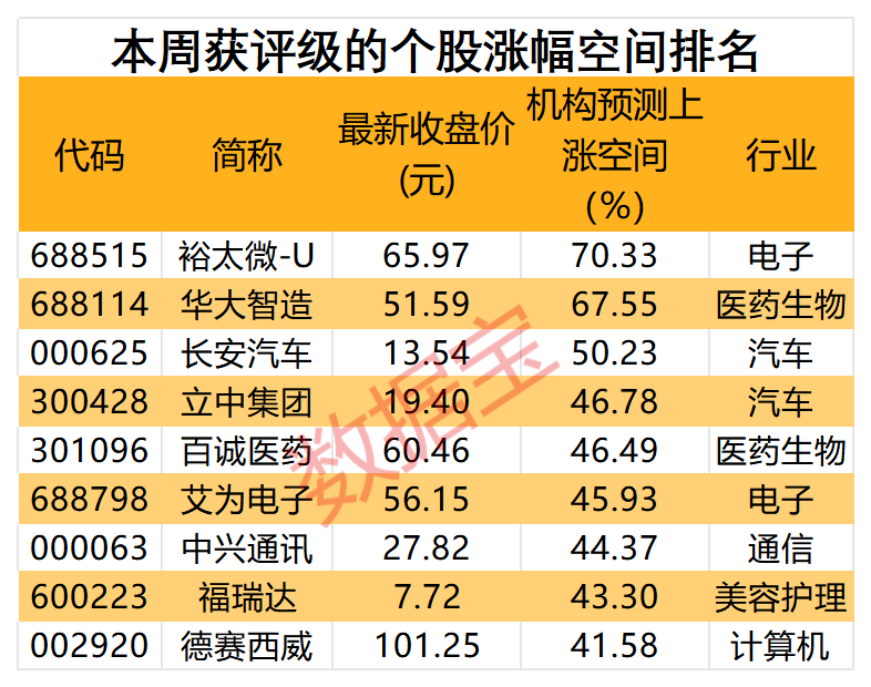 据数据宝统计,本周获2家及以上机构评级的个股中,9股最新收盘价较机构一致预测目标价上涨空间超40%;其中裕太微-U预测上涨空间超70%。