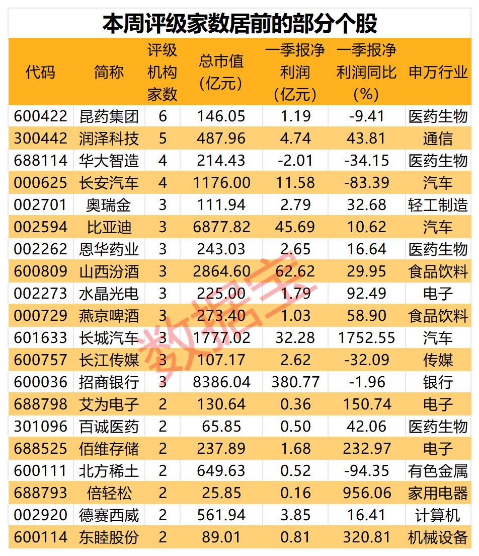 本周,关注度最高的是昆药集团,有6家机构评级;其次,润泽科技有5家机构评级。华大智造、长安汽车则均有4家机构评级。