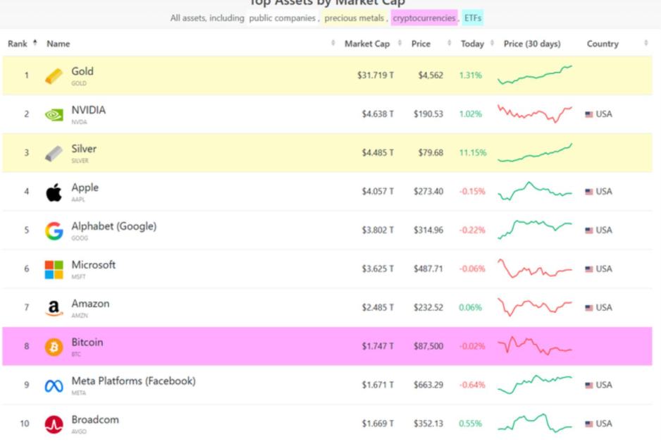 最新统计数据显示,白银一跃成为全球第三大最有价值资产,仅次于黄金和英伟达(NVDA.US)总市值,并将苹果(AAPL.US)、谷歌(GOOGL.US)与微软(MSFT.US)等科技巨头市值甩在身后。