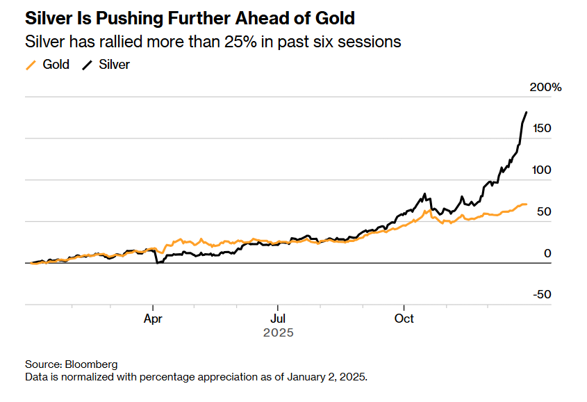 如上图所示的那样,白银今年越来越疯狂,年内涨幅已经高达惊人的165%,并且长期落后于黄金的白银正在进一步跑赢黄金——白银在过去六个交易日累计上涨超过25%。“毫无疑问,我们正在目睹白银市场上演一场世代性的泡沫。” 来自IG Australia 的市场分析师Tony Sycamore表示。