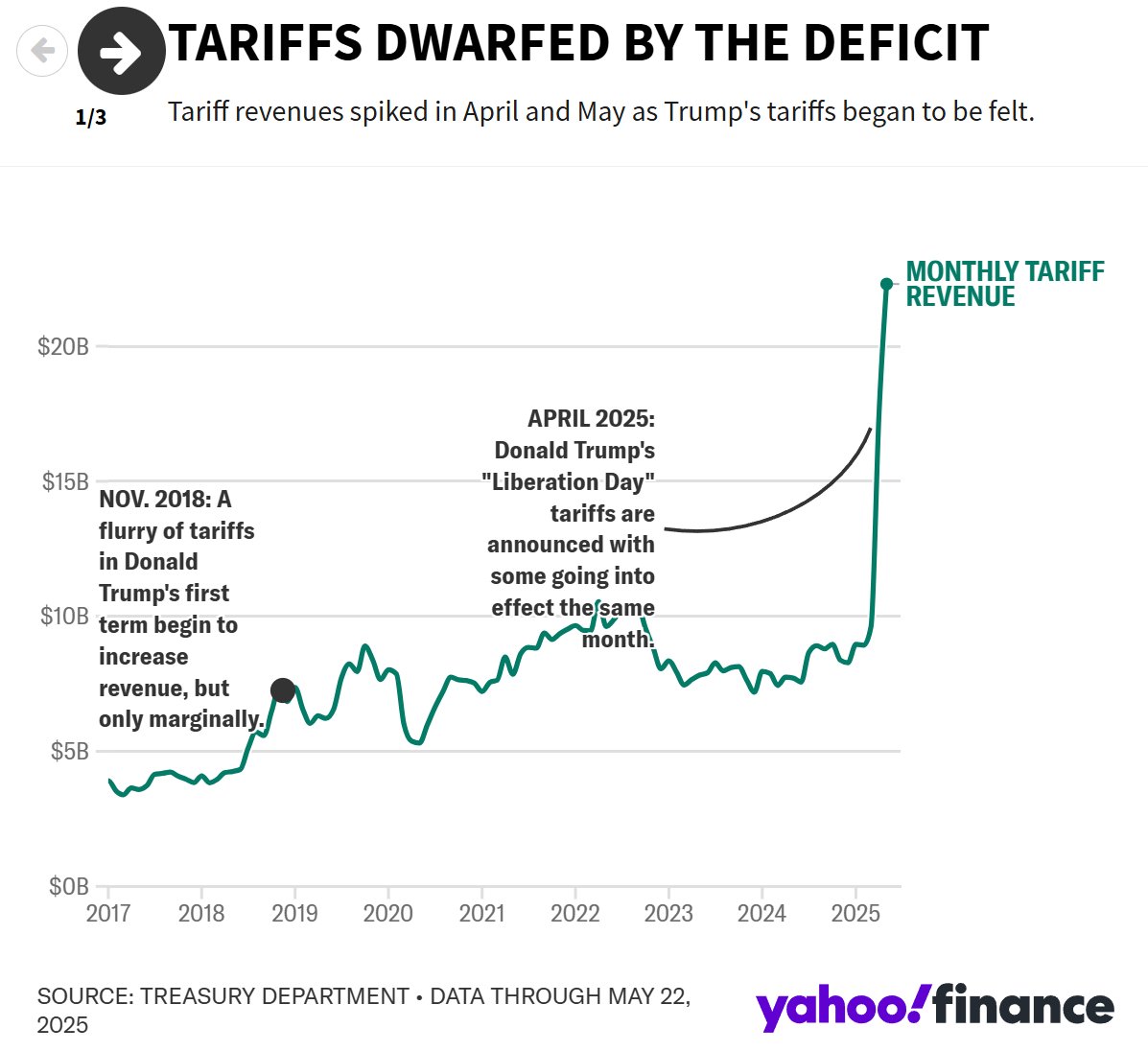 截至目前的5月关税收入已超过4月全月的174亿美元,更远超3月的96亿美元。