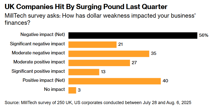 英国企业上季度受英镑汇率飙升冲击——MillTech 调查提问:美元走弱对你们企业的财务影响如何?