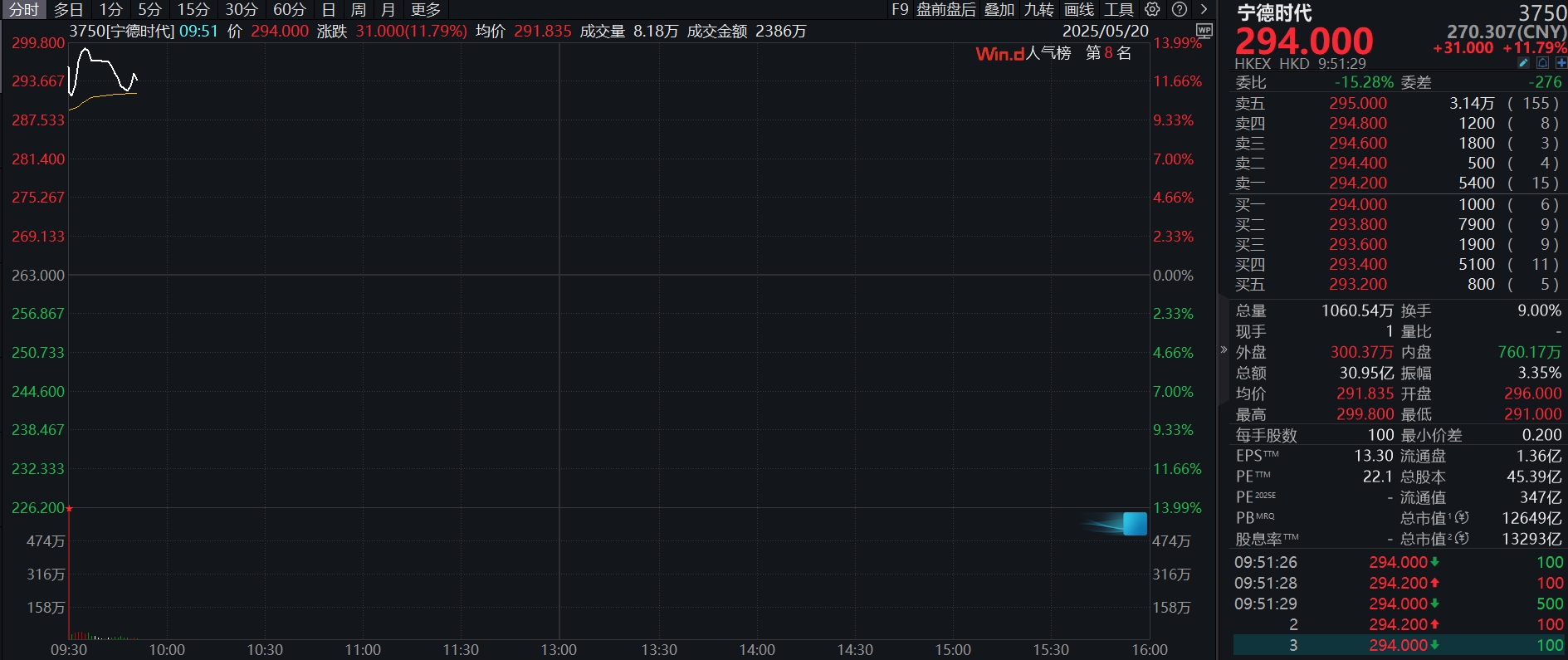 5月20日,宁德时代正式在港交所上市交易,上市首日高开12.55%,报296港元/股。截至发稿,涨11.79%,报294港元/股。