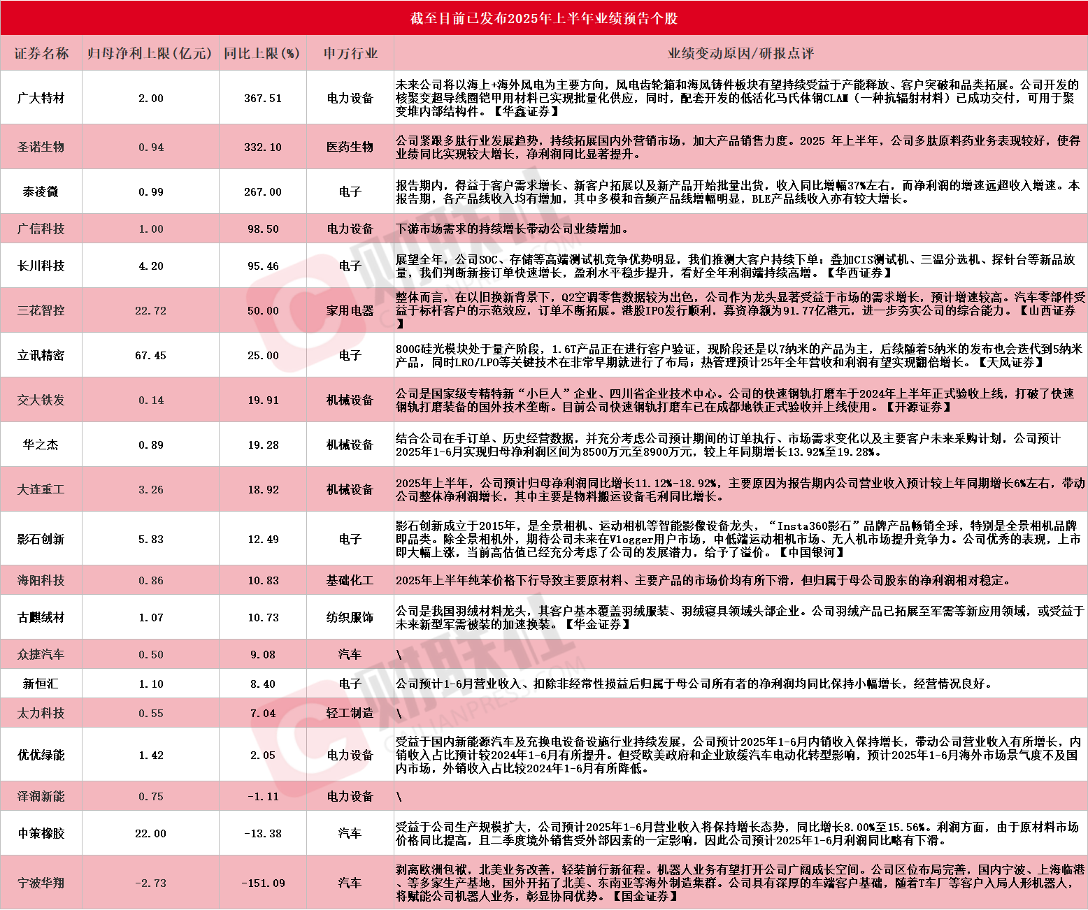 据Choice数据统计,截至发稿,包括广大特材、圣诺生物、泰凌微、广信科技、长川科技、三花智控、立讯精密、交大铁发、华之杰、大连重工、影石创新、海阳科技、古麒绒材、众捷汽车、新恒汇、太力科技、优优绿能、泽润新能、中策橡胶和宁波华翔在内的20家A股上市公司发布2025年上半年业绩预告,具体情况见下图: