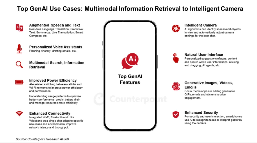 推动这一普及趋势的关键因素之一是GenAI能力的日益平价化。智能手机是体验AI功能的理想载体。如今,中端机型通过软件更新和混合部署的方式实现了GenAI功能的部署。我们可以预见,未来更多中端甚至低端设备将提供基于 GenAI 的用户体验。这意味着用户无需购买旗舰机型,也能享受到 AI 带来的便利。