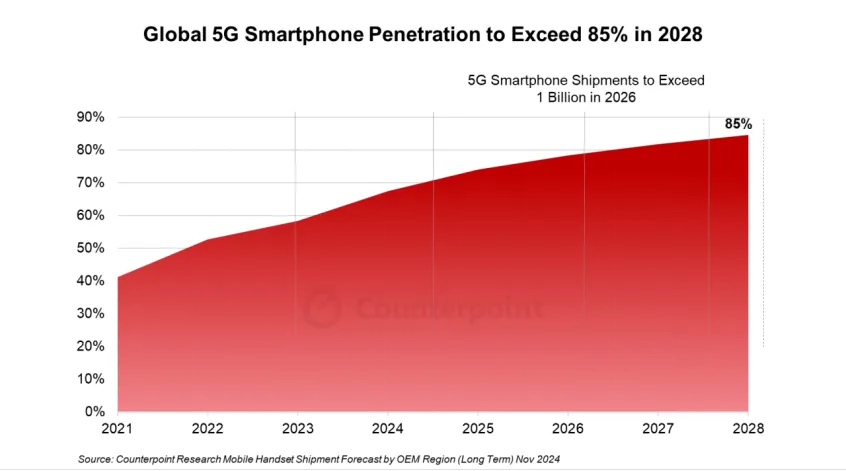 5G技术的日益普及将在GenAI普及中发挥至关重要的作用。5G 的高带宽和低延迟使得用户能够顺畅地访问云端 AI 资源,从而促进了混合 GenAI 模式的应用,尤其是在中端智能手机上。中国手机品牌厂商正积极针对全球用户开发大语言模型(LLM)。它们不断推出新的AI功能,创造新的用户使用习惯,如使用交互式语音助手进行搜索、信息获取以及生成图像和文本。Counterpoint预测,到2028年,全球5G智能手机出货量在2026年将超过10亿部,2028年5G手机出货量渗透率将会达到85%以上。