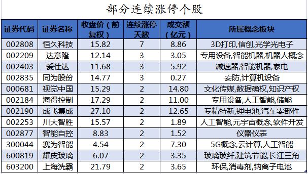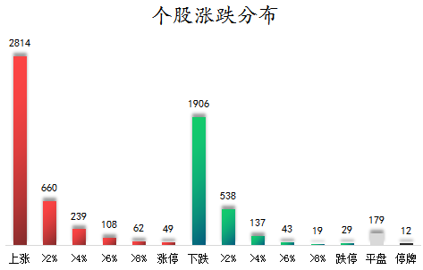 截至收盘,沪深两市合计2814只个股上涨,1906只个股下跌,平盘个股179只,停牌的个股12只。不含当日上市新股,共有49只个股涨停,29只个股跌停。连续涨停天数看,恒久科技已连收7个涨停板,连续涨停板数量最多。