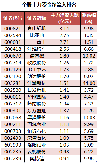 个股来看,今日有1792只个股获主力资金净流入,其中,18股获主力资金净流入超1亿元。京山轻机获主力资金净流入最多,净流入金额为3.14亿元;主力资金净流入居前的个股还有比亚迪、三一重工、江淮汽车、盈方微、牧原股份,净流入金额分别为2.75亿元、2.71亿元、2.56亿元、1.8亿元、1.76亿元。