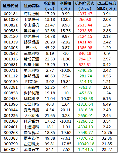 盘后龙虎榜数据显示,今日机构席位资金合计净卖出约3.56亿元。其中,净买入的个股10只,净卖出的个股15只。机构净买入最多的股票是海得控制,净买入金额约4337.47万元;机构净买入居前的还有玉龙股份、京山轻机等股。机构净卖出最多的股票是金域医学,净卖出金额约1.21亿元;机构净卖出居前的还有左江科技、顶点软件、佳沃食品等股。