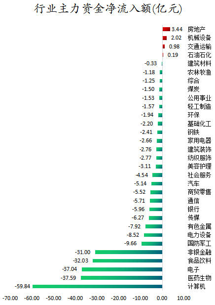 从行业板块来看,申万所属的31个一级行业,今日仅有房地产、机械设备、交通运输、石油石化4个行业板块主力资金呈现净流入,净流入金额分别为3.44亿元、2.02亿元、0.98亿元、0.19亿元。27个行业板块主力资金呈现净流出,其中,计算机行业板块主力资金净流出最多,净流出金额为59.84亿元;行业板块主力资金净流出靠前的还有医药生物、电子、食品饮料、非银金融、国防军工,净流出金额分别为37.59亿元、37.04亿元、32.03亿元、31亿元、9.66亿元。