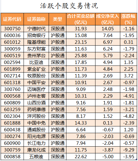 活跃个股方面,北向资金净买入较多的有宁德时代、招商银行、隆基绿能、东方财富、贵州茅台,净买入金额分别为14.05亿元、7.64亿元、6.97亿元、6.24亿元、5.79亿元。北向资金净卖出的有五粮液、康龙化成、长江电力、阳光电源、通威股份,净卖出金额分别为5亿元、3.87亿元、2.04亿元、2.03亿元、0.67亿元。