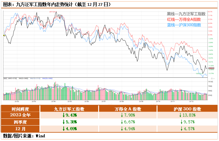 回顾2023年内的国防军工板块与行业动向,压制A股军工行业板块的核心因素可以在宏观、中观与微观层面上同时明确。总的来说,上述三个层面上的因素共振导致了A股投资者对于国防军工板块将在2023年内继续维持高确定性成长主线的基础信心产生了动摇。因此,如果说宏观与中观因素的共振是影响军工板块整体信心基础的灵魂拷问,那么包括情绪偏好在内的市场风格等微观层面因素既是传导影响的过程渠道,也是拖累行业指数的直接因素。立足当下,我们对于2024年军工投资展望的核心逻辑正在被层层验证,微观因素是目前压制板块走势的主要原因。