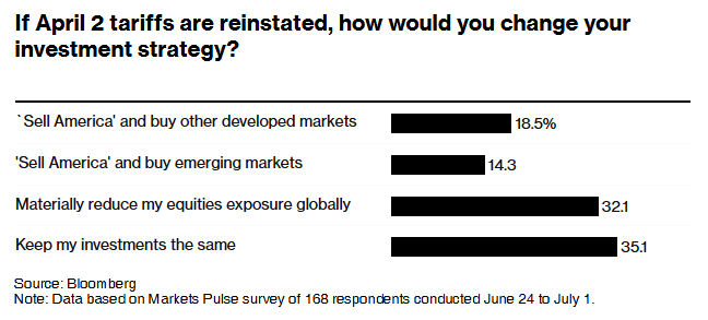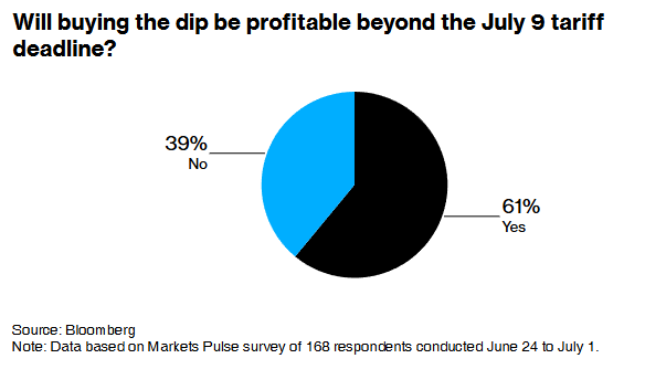 最新的Markets Pulse调查显示,即使本月美国贸易协议最后期限的临近令股市承压,抄底的投资者也将出手。168名受访者中有近三分之二表示,在7月9日特朗普政府恢复所谓对等关税的最后期限之后,“逢低买入”策略仍然是有利可图的,这是因为,超过一半的调查参与者表示,特朗普被认为可能会再次推迟征收关税。