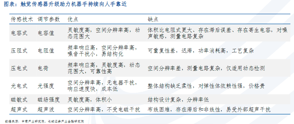 柔性传感器分为压阻式(电阻)、压电式、电容式、光电式、磁敏式、光纤式和超声式等。其中,电阻式、电容式、压电式为目前应用最广泛的柔性触觉传感器类型。