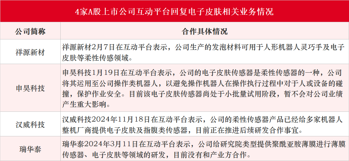 据不完全统计,近期在互动平台回复电子皮肤相关业务情况的A股上市公司有祥源新材、申昊科技、汉威科技和瑞华泰,具体见下图: