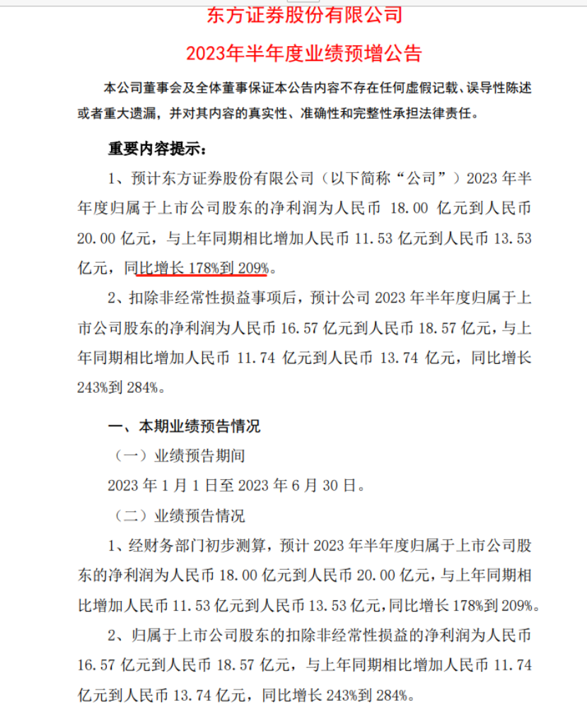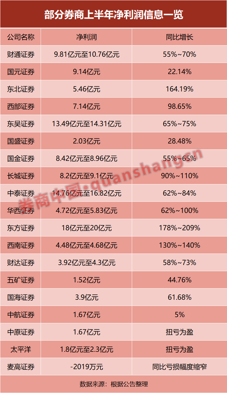 7月14日晚,上半年净利润预增可能达到或超过100%的券商就有3家,包括东方证券、西南证券和华西证券,其中,东方证券业绩增幅最大,最高能达到209%。