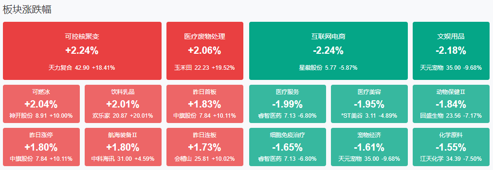 板块方面,可控核聚变、饮料制造、垃圾分类、深海科技等板块涨幅居前,电商、宠物经济、CRO、影视等板块跌幅居前。截至收盘,沪指涨0.07%,深成指跌0.04%,创业板指涨0.02%。