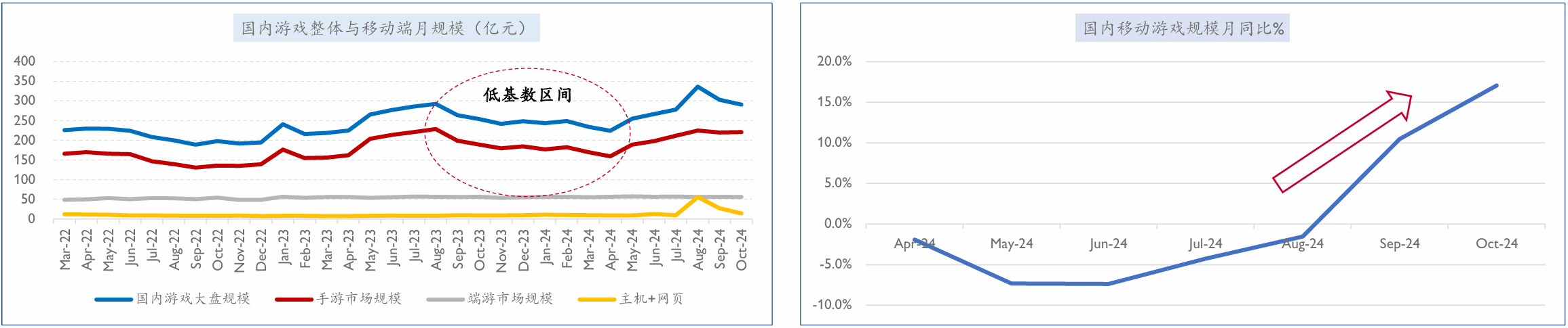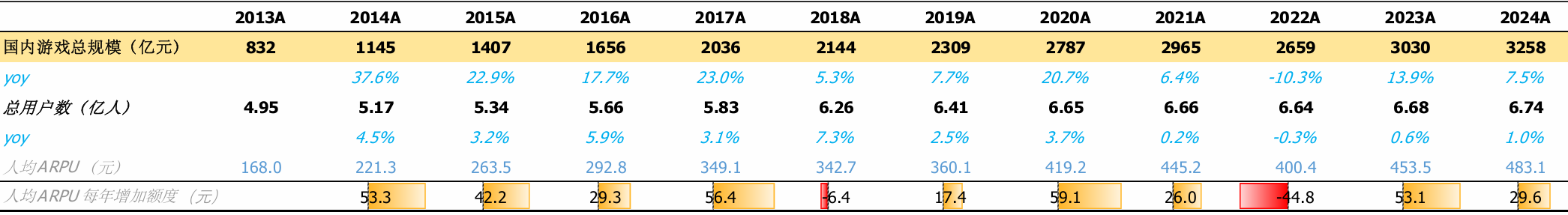 2024年国内游戏市场规模达到3258亿,同比增长7.5%,人均ARPU为483.1元,创历史新高。2024年国内游戏市场呈现前低后高的发展态势,经过2023年下半年以及2024Q1的调整,Q2开启底部复苏。根据游戏工委数据披露显示,国内游戏月度规模在2023年9月~2024年4月之间,进入下降轨道,而2024年5月开始,出现明显反弹复苏,而后进入加速通道,月规模同比数据呈现加速上扬态势。
