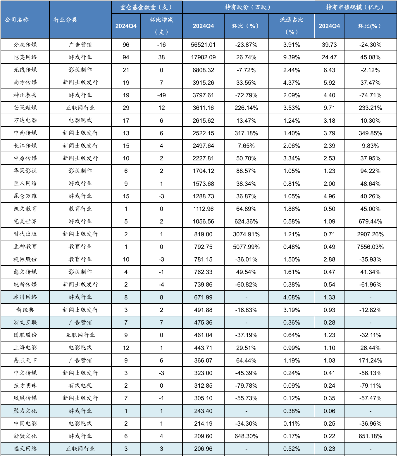 24Q4,游戏板块,7家公司获增持(完美世界、昆仑万维、巨人网络、顺网科技、浙数文化、电魂网络、恺英网络),4家公司获公募新进(世纪华通、冰川网络、聚力文化、天娱数科),6家公司遭减持(掌趣科技、宝通科技、汤姆猫、吉比特、三七互娱、神州泰岳)。