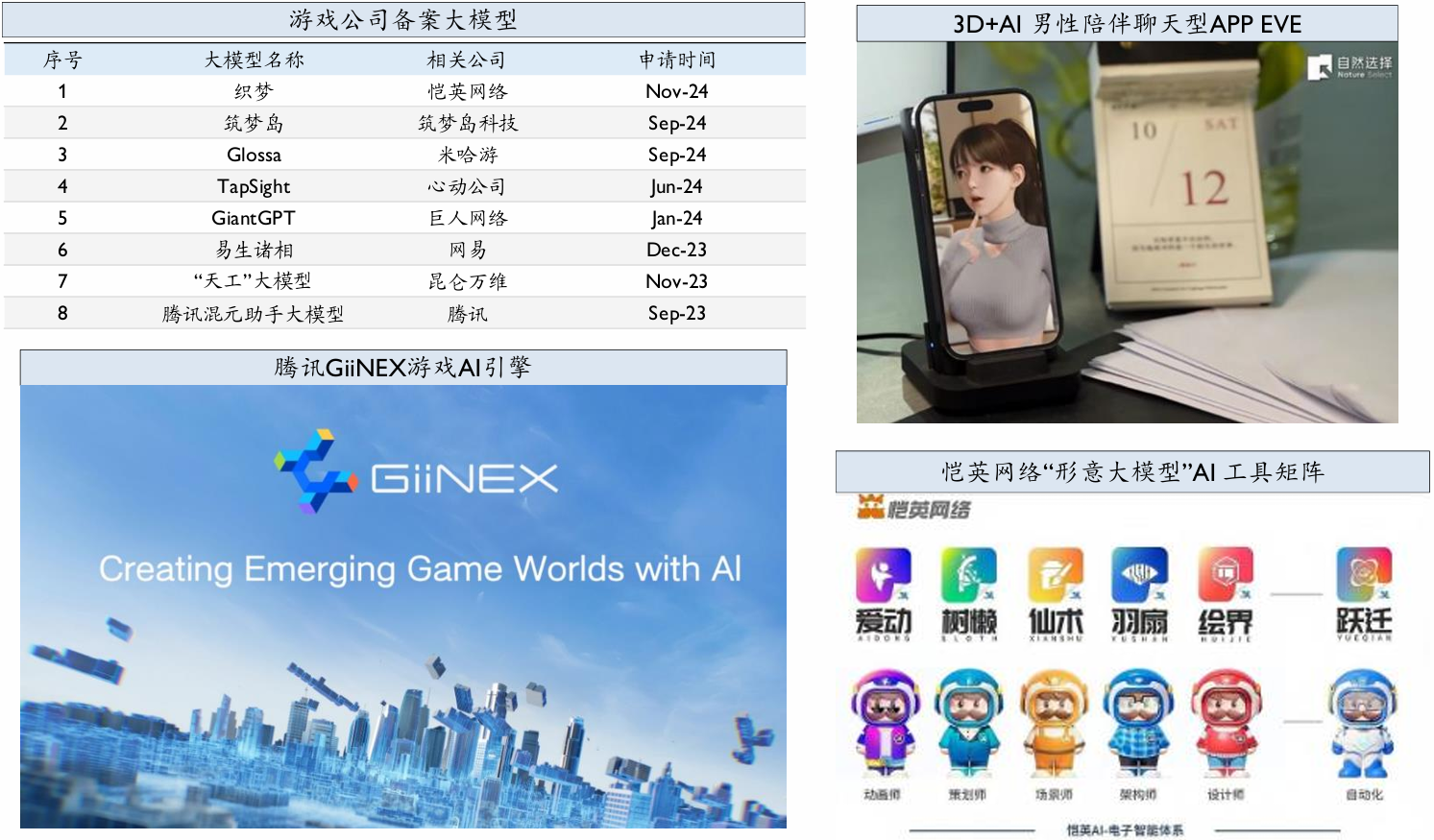 1、工具型(2D\3D素材建模生成+视频生成+剧情/世界观编写+NPC+代码编写,例如恺英网络“形意大模型”