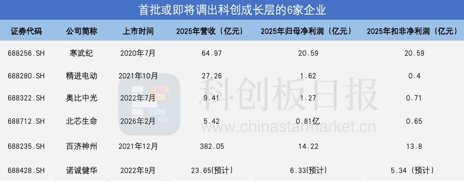 北芯生命于2月27日晚间披露的业绩快报显示,公司2025年度实现营收5.42亿元,同比增长71.23%;归母净利润8062.19万元,同比扭亏;扣非净利润6513.95万元,上年同期亏损。北芯生命是科创成长层落地后新注册上市的企业,其2026年2月才在科创板上市,上市首年即有望调出科创成长层。