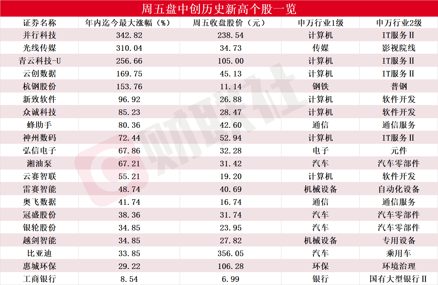 据Choice数据统计显示,包括并行科技、光线传媒、青云科技-U、云创数据、杭钢股份、新致软件、众诚科技、蜂助手、神州数码、弘信电子、湘油泵、云赛智联、雷赛智能、奥飞数据、冠盛股份、银轮股份、越剑智能、比亚迪、惠城环保和工商银行在内20家A股上市公司周五盘中创出历史新高(前复权),具体详见下图: