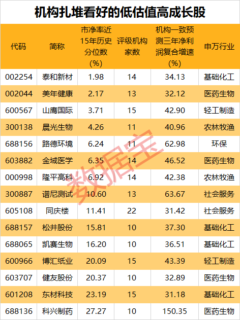 数据宝在所处上述6个行业的A股公司中,按照2020年底前上市、最新市净率处于近15年历史分位数的30%以下水平、机构评级数量超10家且一致预测2024年—2026年净利润复合增速超30%进行筛选,15只个股浮出水面。