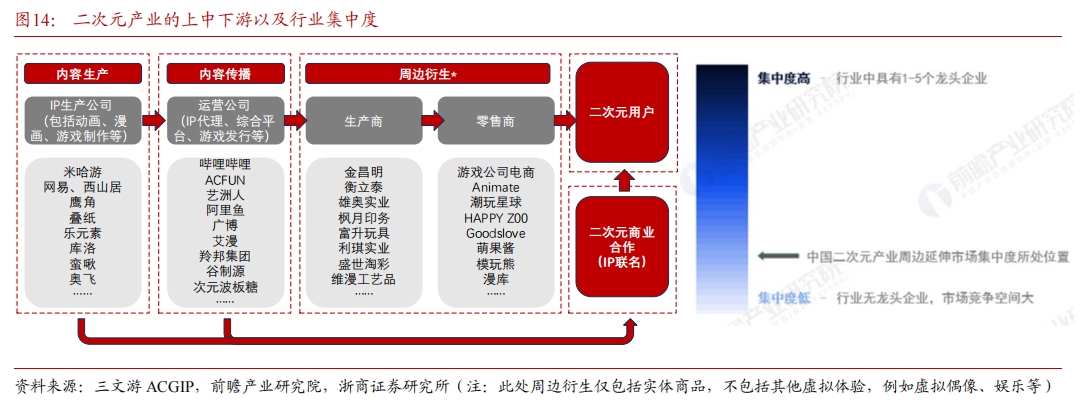 浙商证券分析师马远方、马莉11月22日研报指出,中国二次元产业链包括内容生产、内容传播和周边衍生三部分。其中,内容生产包括动画制作、漫画制作、游戏制作,代表性公司有米哈游、网易等;内容传播包括海外内容代理、综合平台、动漫平台、资讯平台、游戏发行等,代表性公司有哔哩哔哩、ACFUN、阿里鱼等;衍生周边包括二次元商品、虚拟偶像、线下娱乐、服装等,其中二次元商品(谷子)通过广泛的生产商与零售商,触达到终端二次元消费者。