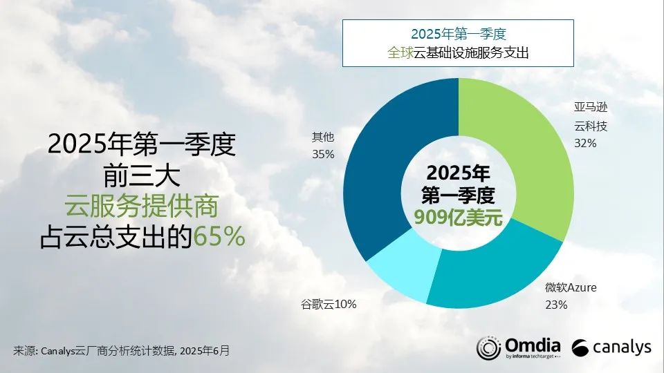 Canalys的最新数据显示,2025年第一季度全球云基础设施服务支出达909亿美元,同比增长21%。云与 AI 基础设施的大规模投入,已成为2025年市场发展的关键主题之一。与此同时,为加速企业大规模采用AI,领先云厂商正加快基础设施优化,尤其通过自研芯片的方式,旨在降低 AI 使用成本、提升推理效率。2025年第一季度,三大云厂商(亚马逊云科技、微软Azure和谷歌云)的市场排名保持不变,合计占据全球云支出的65%。三家头部云厂商的云相关支出合计同比增长24%。