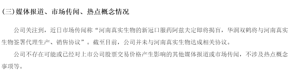 此外,在公告中,华润双鹤对近日市场传闻“河南真实生物的新冠口服药兹夫定即将揭盲,华润双鹤将与河南真实生物签署代理生产、销售协议”也作出了回应。华润双鹤表示,截至目前,其并未与河南真实生物达成相关协议。公司不存在可能或已经对上市公司股票交易价格产生影响的其他媒体报道或市场传闻,不涉及热点概念事项等。