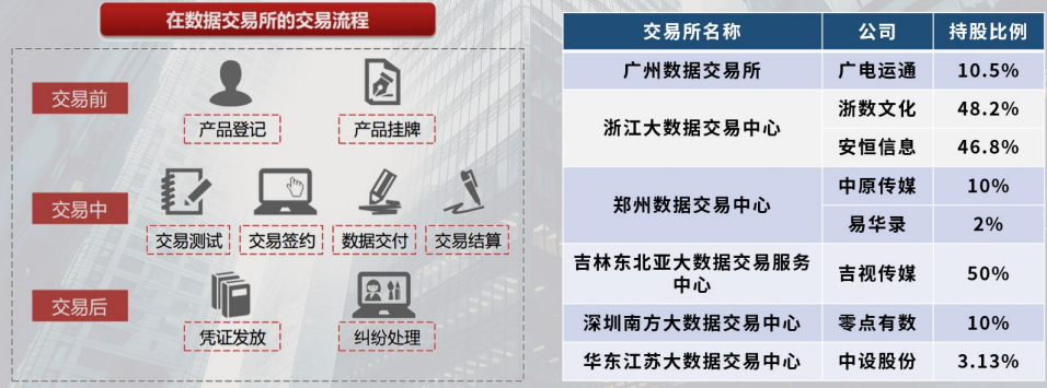 数据交易所是数据交易的关键环节。人民网(持股人民数据60%,人民数据已陆续和贵数所、浙数交、武汉长江数交合作,推动数据产品和服务互联互通)、新华网(新华数据要素联合平台)、云赛智联(上海市政府唯一数字平台公司)