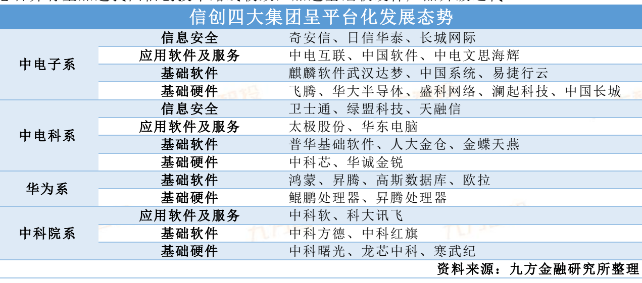 产业方面,中国电子与华为开展深度合作,共建“鹏腾”生态。我国信创生态目前碎片化的问题较为突出,处理器有六家主要企业同台竞技,但均未能形成统一主导的技术路线,导致下游生态较为割裂,带来了较为繁复的兼容适配问题,也分散了有限的研发和技术资源。中国电子(CEC)具备央企背景和广泛的政企市场资源,与华为的技术优势和广泛生态体系可以形成有效互补。中国电子和华为作为我国最重要的两大信创生态集团,其生态合并有望加速我国信创技术路线收敛,加速基础软硬件产品升级迭代。