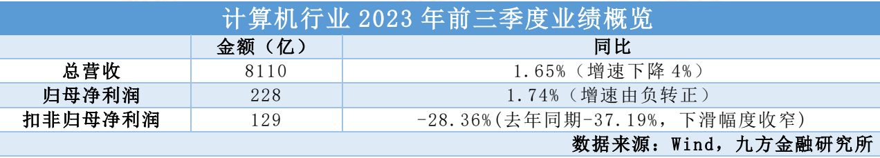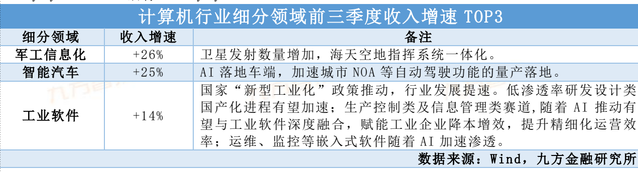 收入增长前三的细分领域包括:军工信息化(yoy+26%)、智能汽车(yoy+25%)、工业软件(yoy+14%)。归母净利润增长前三的细分领域包括:智能汽车(yoy+49%)、非银IT(yoy+17%)、银行IT(yoy+15%)。