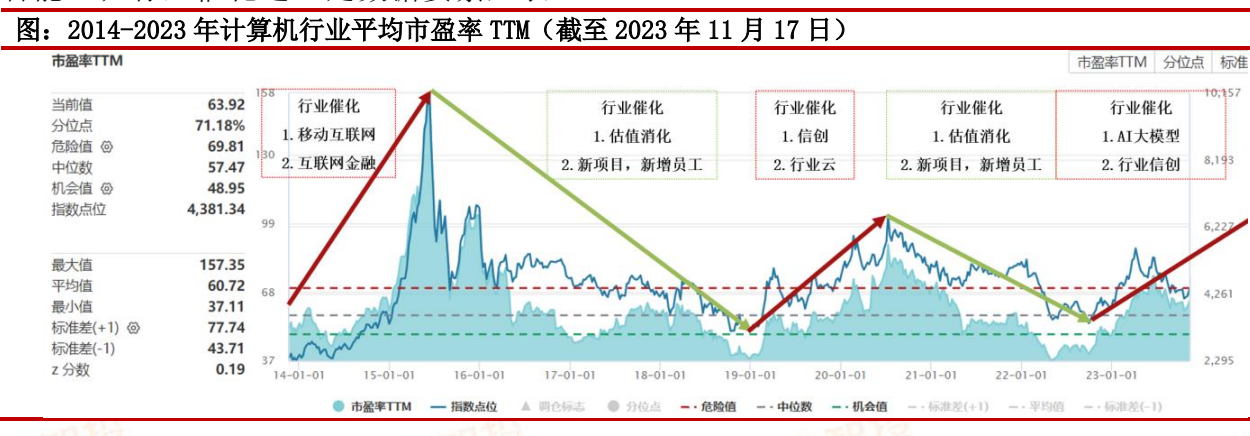 2022年10月至2023年6月,计算机板块先后受信创和AI两个产业趋势影响,估值水平提升明显。在2022年Q3,计算机行业PE(TTM)在40X左右筑底,信创驱动PE(TTM)上行至50X;2023年AI催化PE(TTM)继续上行至70X;数据驱动力为AI大模型引发生产方式和生产力变革扩散化趋势明显,计算机一二线公司均有较强表现。6月20日达到本轮高点,11月17日计算机PE(TTM)60X,于五年来70%分位水平,高于五年来平均水平57倍,估值中枢较2022年提升明显,低于2020年水平。