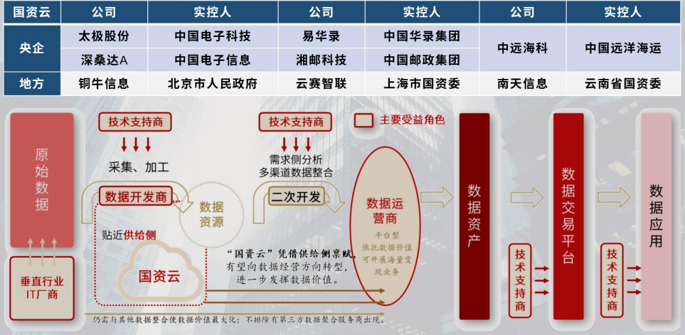国资云厂商有望与国资委共建共营,在提供技术支持的同时享受数据资产托管运营红利。国资云主要受益公司:中国联通(运营商)、云赛智联(上海)、铜牛信息(北京)、深桑达(央企)、太极股份(央企)等、中远海科(中国远洋海运)等。