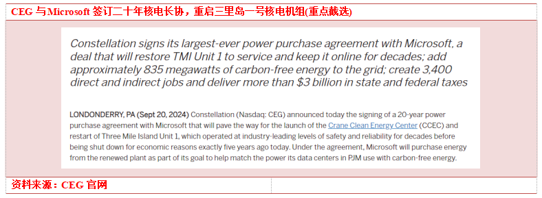 9月20日,CEG与Microsoft签订二十年核电长协,重启于2019年退役的835MW三里岛核电1号机组,机组预计于2028年重新投产,其生产的全部核电电力并入PJM电力市场以满足Microsoft位于PJM境内多个数据中心的清洁电力需求。根据Constellation披露资料和说明会,预计机组复产后将在20年内贡献16$bn收入,年发电量7mnMWh,估算对应度电电价114$/MWh,公司拆分其中30$/MWh为IRA补贴,其余为向Microsoft卖电PPA电价及机组容量价值。