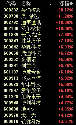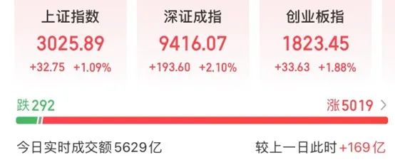 今天上午,A股强势反弹,截至收盘,上证指数上涨1.09%,深证成指上涨2.1%,创业板指上涨1.88%。沪深两市逾5000只个股上涨。调整多日的TMT板块迎来全面反攻,铜缆高速连接、AI手机、Sora概念等板块大涨。浪潮信息涨停,成交额为73.1亿元,居A股第一。